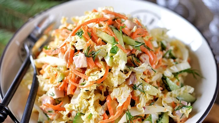 - Pane kaussi hiina kapsas, porgand, kurk, munavalge, ürdid, lisa sool, sega õrnalt läbi, maitsesta kastmega ja sega uuesti.